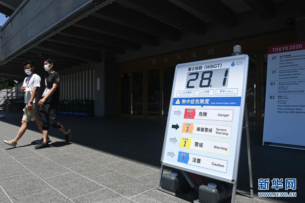這是7月21日拍攝的日本武道館門前的氣溫指示牌。