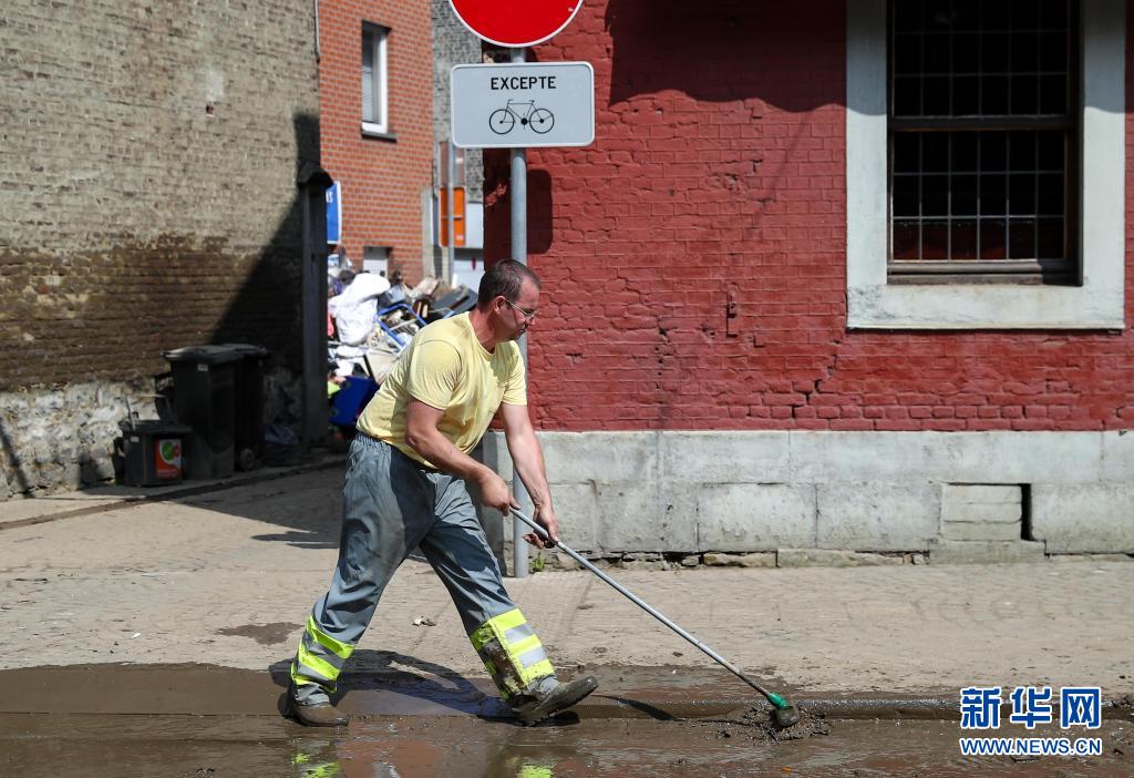 7月20日,一名工作人員在比利時受災嚴重的佩平斯特清掃街道。