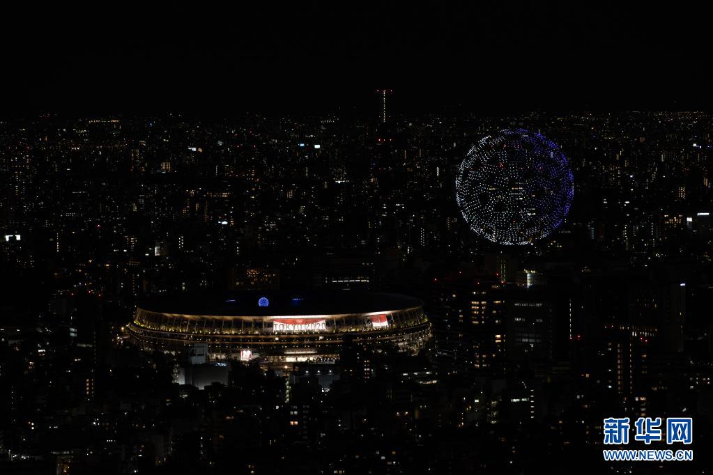 這是7月23日拍攝的開幕式上新國立競技場上空的無人機表演。新華社記者 徐子鑒 攝