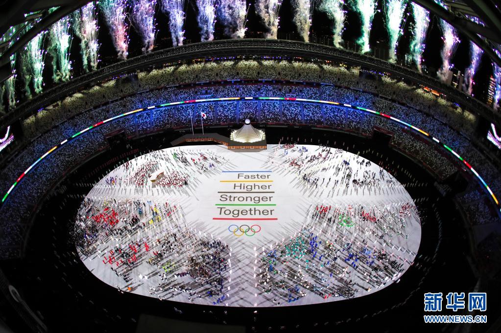 這是東京奧運會開幕式場地中央顯示的奧林匹克格言“更快、更高、更強、更團結”(7月23日攝)。新華社記者 徐子鑒 陳益宸 夏一方 攝