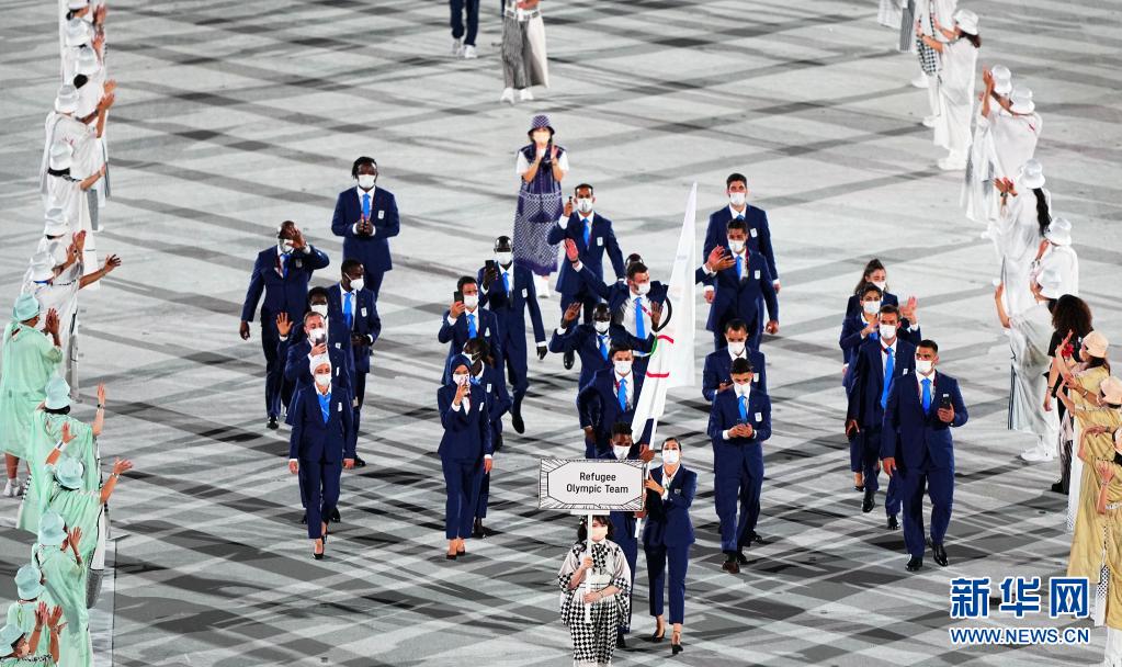 7月23日,東京奧運會難民代表團在開幕式上入場。新華社記者 潘昱龍 攝