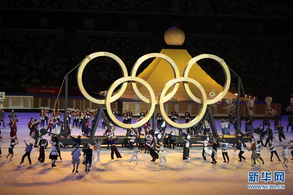 這是7月23日拍攝的東京奧運會開幕儀式上展示的五環圖案。新華社記者 潘昱龍 攝