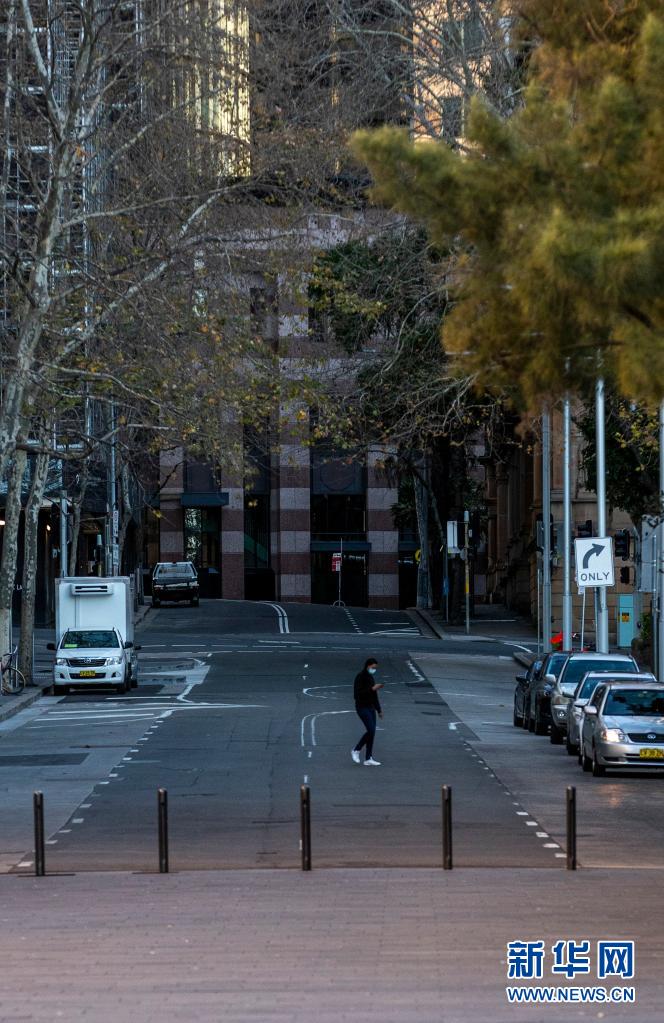 7月24日,行人走在澳大利亞悉尼空蕩的街道上。 由于新冠確診病例持續攀升,澳大利亞第一大城市悉尼所在的新南威爾士州23日宣布進入“緊急狀態”。 新華社記者 白雪飛 攝