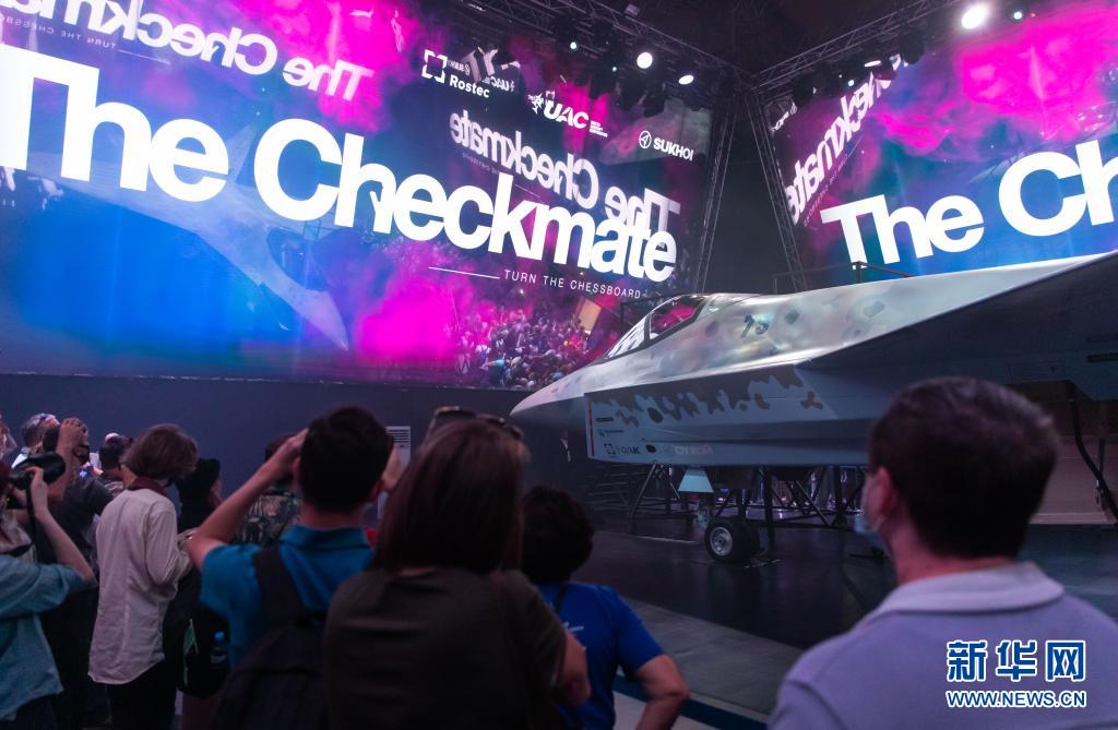 7月25日,在俄羅斯首都莫斯科附近的茹科夫斯基市,人們觀看俄第五代單發(fā)多用途輕型戰(zhàn)斗機(jī)“Checkmate”的原型機(jī)。 第15屆莫斯科國(guó)際航空航天展覽會(huì)于7月20日至25日在俄羅斯首都莫斯科附近的茹科夫斯基市舉行。 新華社記者 白雪騏 攝