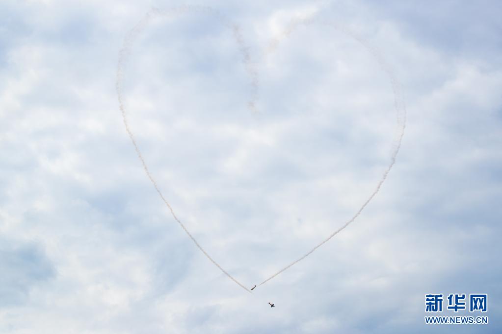 7月25日,在俄羅斯首都莫斯科附近的茹科夫斯基市,“首航”飛行表演隊(duì)在空中飛出一個(gè)心型圖案。 第15屆莫斯科國(guó)際航空航天展覽會(huì)于7月20日至25日在俄羅斯首都莫斯科附近的茹科夫斯基市舉行。 新華社記者 白雪騏 攝