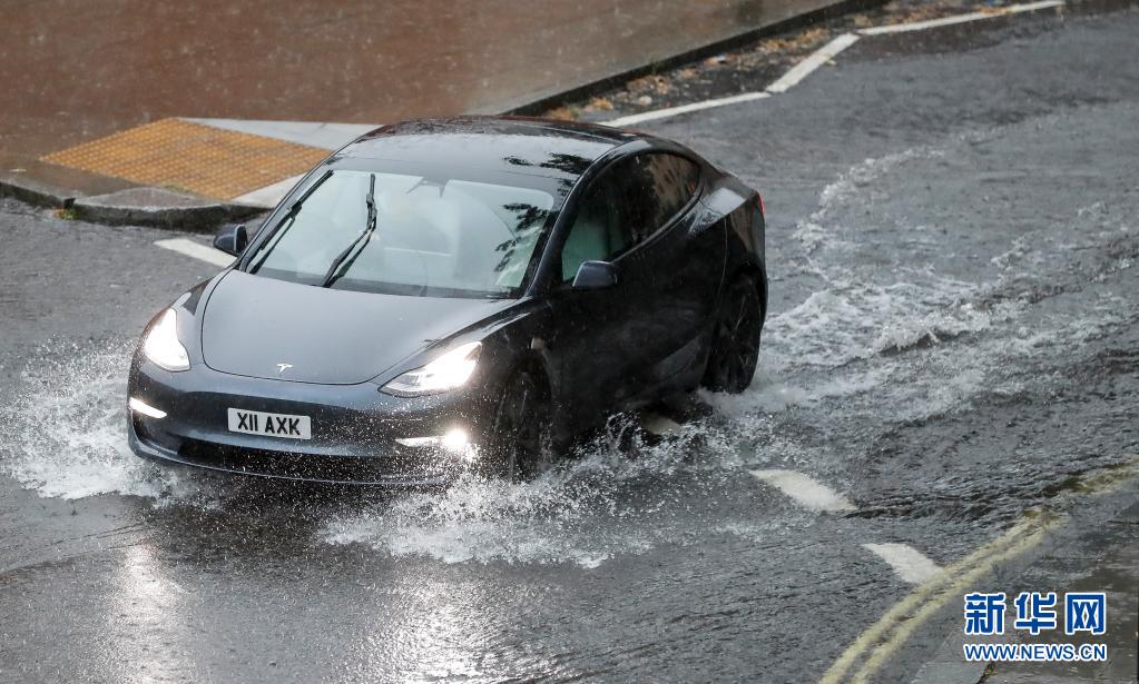 7月25日,一輛汽車在英國(guó)倫敦積水的路面上行駛。