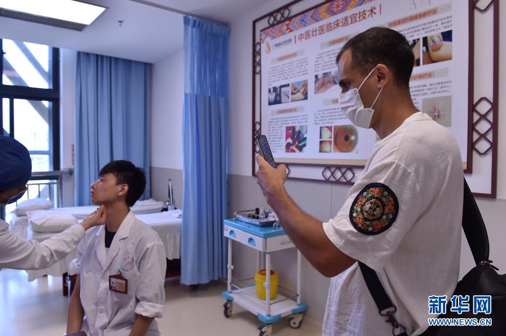 7月14日,莫小龍(右)在廣西國際壯醫醫院參觀學習時,用手機拍攝壯醫藥線點灸療法。 今年40歲的加布里埃爾·德·莫拉斯來自巴西里約熱內盧,是廣西南寧市一家武館的武術教練,他很早就對中國功夫和中國文化有著濃厚興趣。受中國功夫巨星李小龍的影響、渴望成為巴西“李小龍”的他給自己起了個中國名字——莫小龍。 2008年,莫小龍作為交換生來到中國,在北京中醫藥大學交流學習。結束學習后,莫小龍返回巴西,在自己的家鄉開了武館,同時在當地教授針灸課程。 2016年,莫小龍和妻子一起返回了妻子的家鄉廣西南寧。他師從新的武術老師,不斷地精進自己的武術水平,還在空余時間到中醫院參觀學習,并通過網絡將其教授給巴西學員。莫小龍希望能讓更多的巴西人通過自己了解中國文化。 新華社記者 劉嶺逸 攝 |
