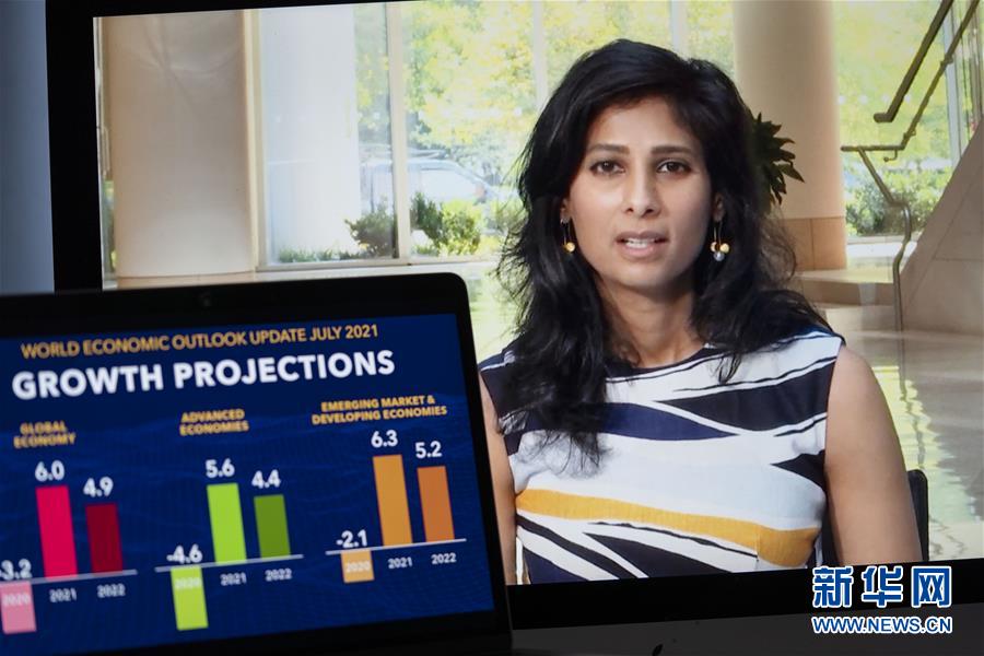 這是7月27日拍攝的國際貨幣基金組織(IMF)首席經濟學家吉塔·戈皮納特在美國華盛頓出席線上視頻新聞發布會的畫面。 當日,國際貨幣基金組織(IMF)發布《世界經濟展望報告》更新內容,將2021年全球經濟增長預期維持在6%不變,但警告復蘇步伐正加劇分化。 新華社記者劉杰攝