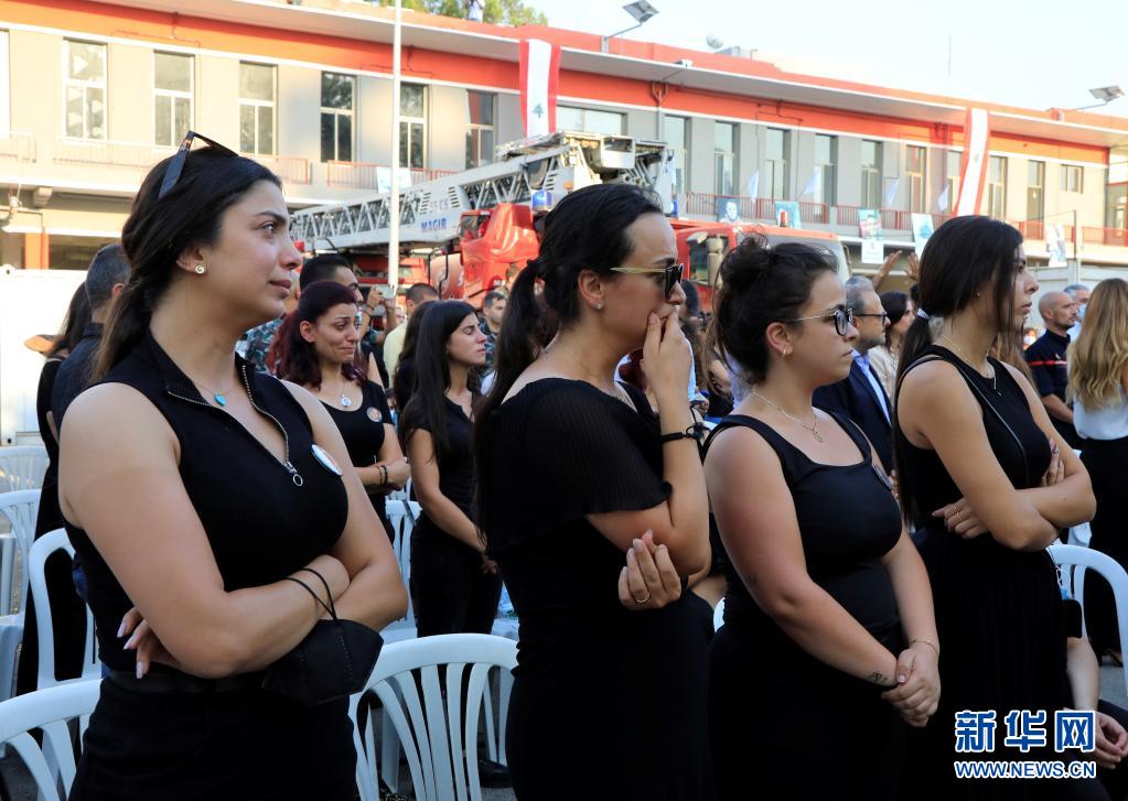 8月3日,犧牲消防員的家屬在黎巴嫩貝魯特消防隊總部出席貝魯特港口大爆炸一周年紀念活動。