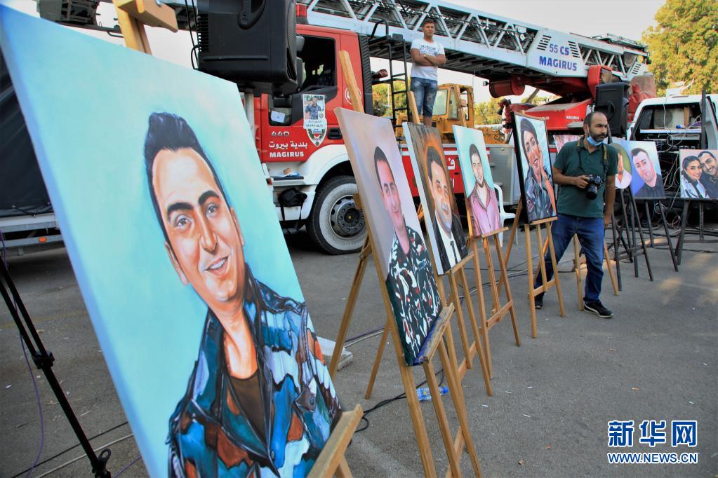 8月3日,黎巴嫩貝魯特消防隊總部展出在大爆炸中犧牲的消防員肖像,紀念貝魯特港口大爆炸一周年。新華社記者 劉宗亞 攝