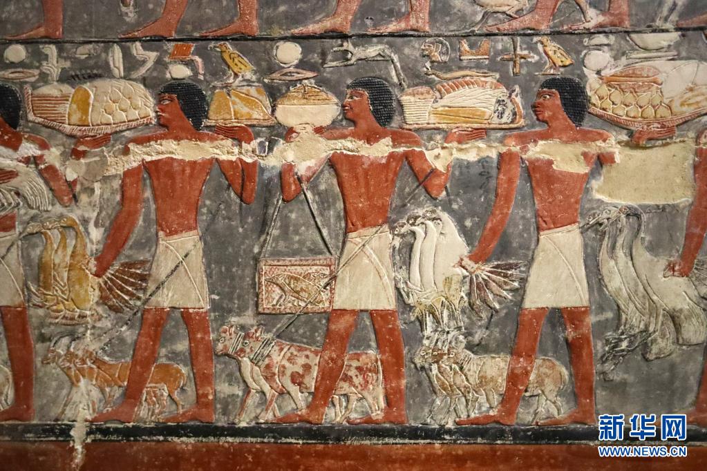 這是8月3日在埃及首都開羅以南的塞加拉地區一個官員墓內拍攝的彩繪浮雕壁畫。