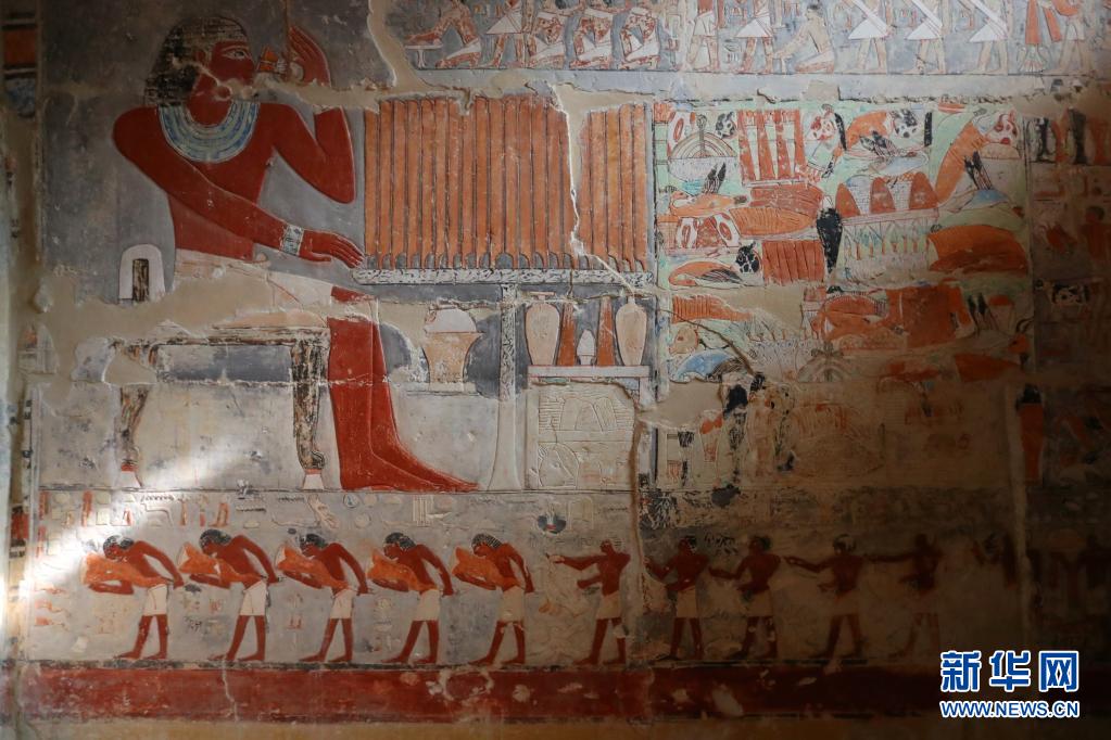 這是8月3日在埃及首都開(kāi)羅以南的塞加拉地區(qū)一個(gè)官員墓內(nèi)拍攝的彩繪浮雕壁畫(huà)。