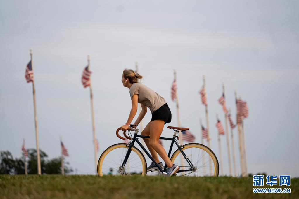 8月6日,一名女子在美國首都華盛頓的國家廣場騎自行車。