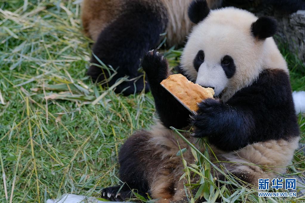 8月8日,大熊貓“寶弟”在比利時布呂熱萊特天堂動物園享用“生日蛋糕”。 當日,比利時布呂熱萊特天堂動物園為大熊貓雙胞胎“寶弟”“寶妹”慶祝兩歲生日。2014年2月23日,大熊貓“星徽”和“好好”作為中比友好使者來到比利時,2019年8月8日,“好好”誕下雙胞胎“寶弟”和“寶妹”。加上2016年6月1日“好好”在比利時產下的雄性幼仔“天寶”,目前共有5只大熊貓在比生活。 新華社記者 張鋮 攝