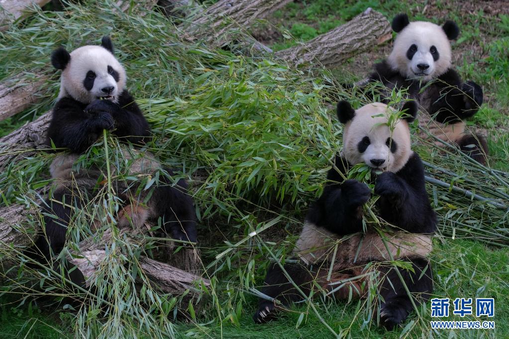 8月8日,在比利時布呂熱萊特天堂動物園,大熊貓“寶弟”(右)、“寶妹”(左)和媽媽“好好”一起吃竹子。 當日,比利時布呂熱萊特天堂動物園為大熊貓雙胞胎“寶弟”“寶妹”慶祝兩歲生日。2014年2月23日,大熊貓“星徽”和“好好”作為中比友好使者來到比利時,2019年8月8日,“好好”誕下雙胞胎“寶弟”和“寶妹”。加上2016年6月1日“好好”在比利時產下的雄性幼仔“天寶”,目前共有5只大熊貓在比生活。 新華社記者 張鋮 攝