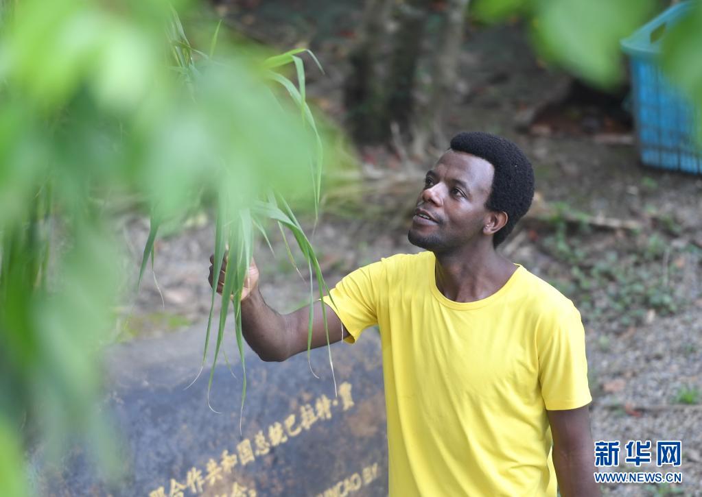 8月12日,盧旺達留學生歐貝德·尼伊姆巴巴茲在觀察巨菌草的生長情況。