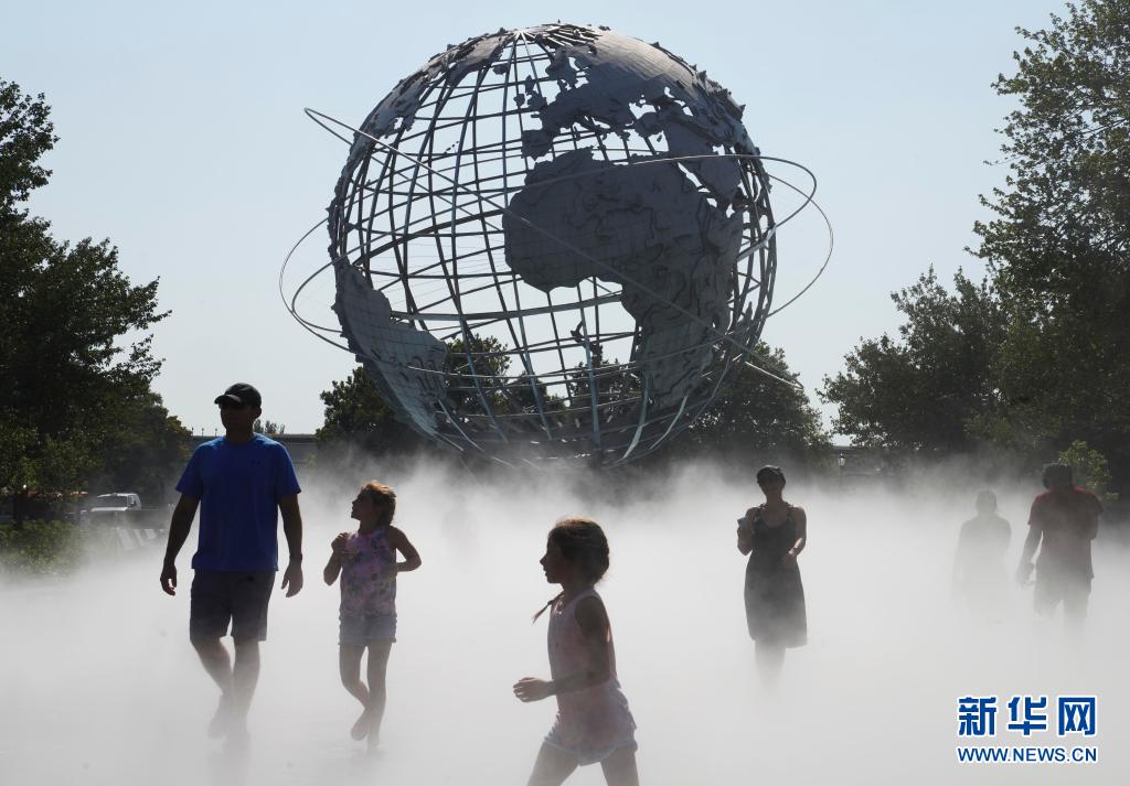 8月13日,人們在美國紐約科羅納公園的水霧廣場休閑。