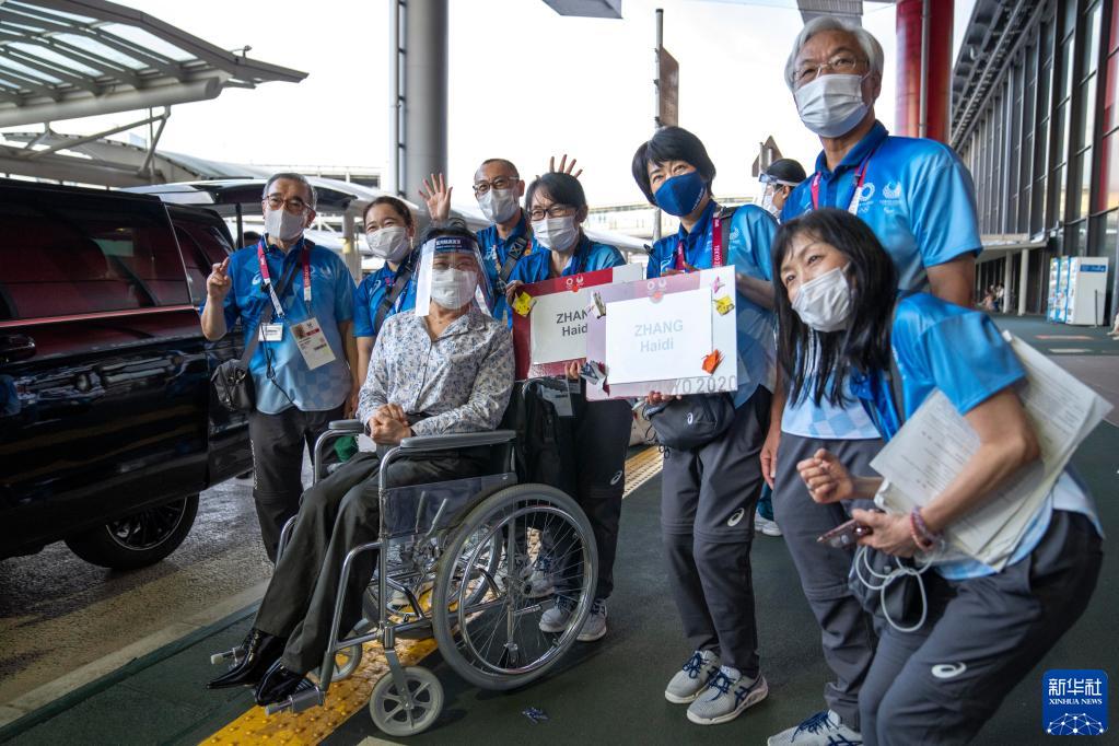 8月22日,第16屆殘奧會中國體育代表團團長、中國殘聯主席、中國殘奧委員會主席張海迪(中)抵達東京成田機場后與志愿者交談。 當日,東京殘奧會中國體育代表團第三批團隊抵達東京。 新華社記者 熊琦 攝