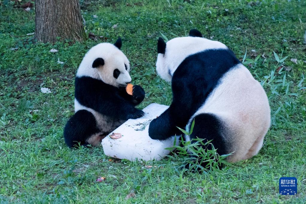 8月21日,在美國華盛頓史密森學會國家動物園,大熊貓“小奇跡”(左)和媽媽“美香”享用水果冰蛋糕。