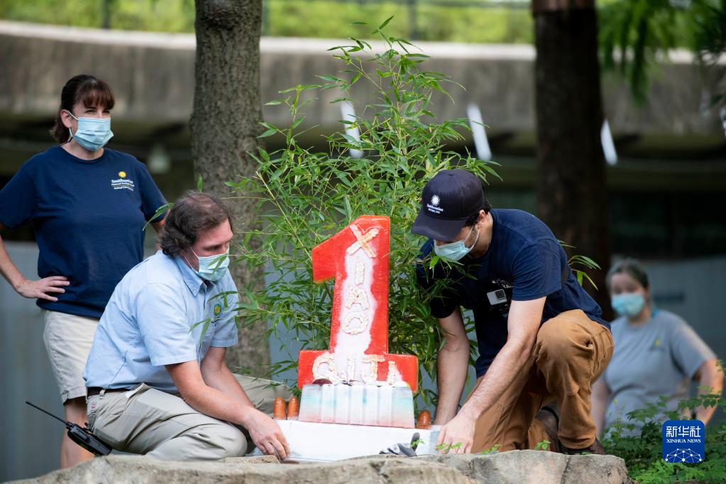 8月21日,美國華盛頓史密森學會國家動物園的工作人員為大熊貓“小奇跡”準備水果冰蛋糕。給“小奇跡”特制的大蛋糕上面插著一根紅色蠟燭形狀的“1”,是葡萄蘋果汁稀釋后冰凍而成的。
