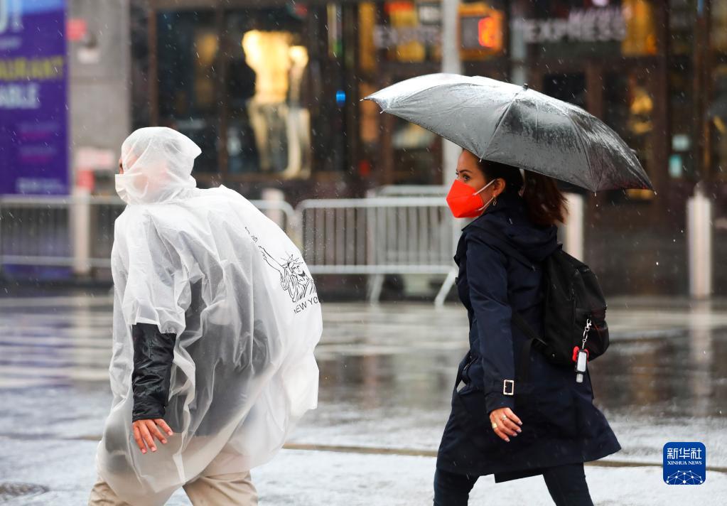 8月22日,人們行走在雨中的美國紐約時報廣場上。受熱帶風(fēng)暴“亨利”影響,美國紐約當日迎來降雨天氣。新華社記者 王迎 攝