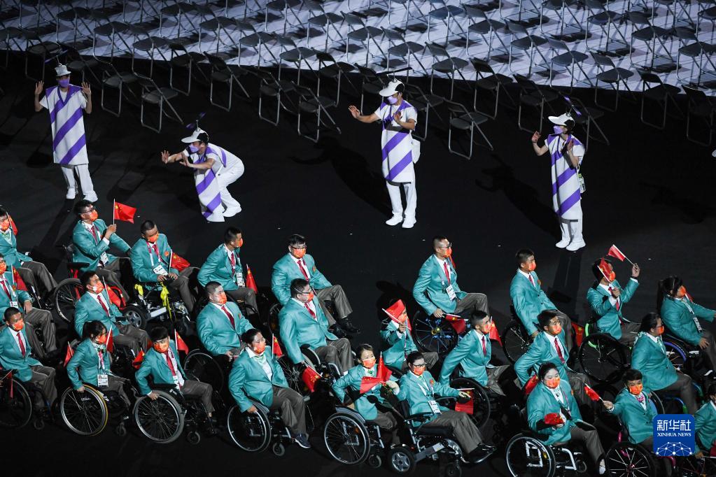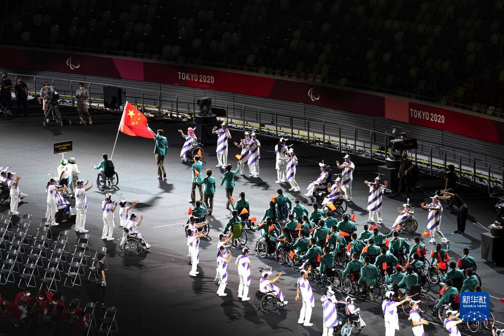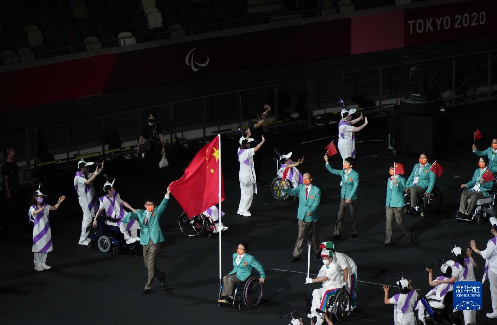 8月24日,第16屆夏季殘疾人奧林匹克運(yùn)動(dòng)會(huì)開幕式在日本東京舉行。 這是中國(guó)體育代表團(tuán)旗手王浩(左四)、周佳敏(左五)入場(chǎng)。 新華社記者 朱煒 攝