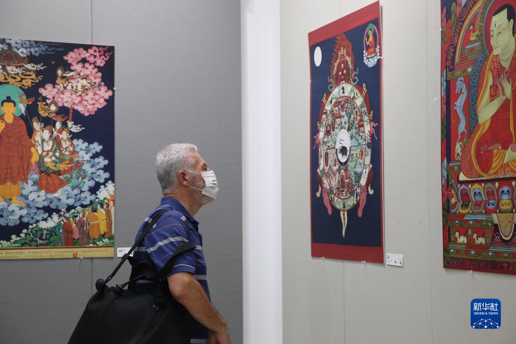 8月25日,一名觀眾在馬耳他首都瓦萊塔欣賞唐卡作品。 正值西藏人民歡慶西藏和平解放70周年之際,“中國西藏·扎西德勒”西藏唐卡藝術展20日以線下和線上相結合的方式在馬耳他正式拉開帷幕。展覽由馬耳他中國文化中心和西藏自治區文化廳共同舉辦,將持續到10月6日。 新華社記者 陳文仙 攝