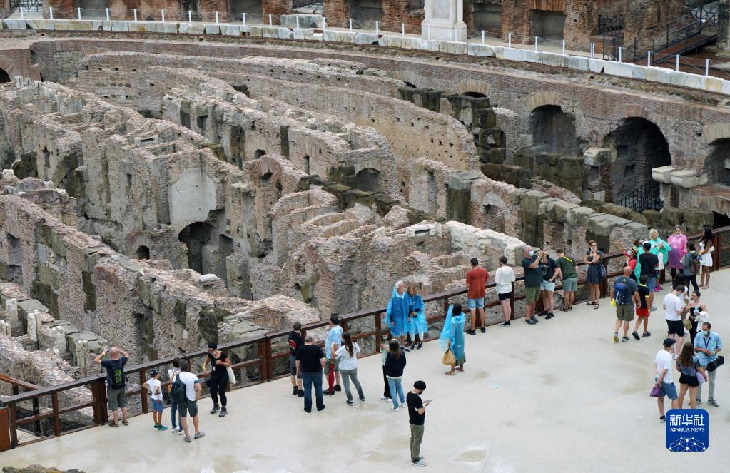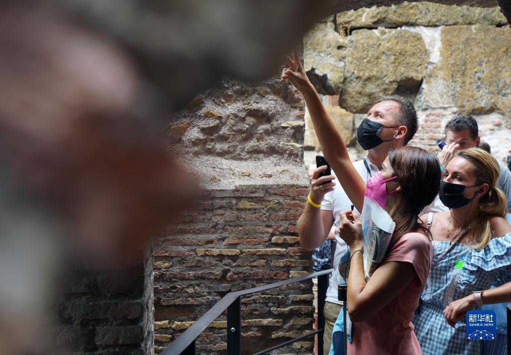 8月24日,導(dǎo)游帶領(lǐng)游客參觀意大利羅馬斗獸場的下層區(qū)域。 經(jīng)過一段時間的修復(fù)工作后,意大利羅馬斗獸場的下層區(qū)域于今年6月向公眾開放。斗獸場下層區(qū)域包含房間和通道等,曾是競技表演前角斗士和猛獸的容身之處。 新華社記者 金馬夢妮 攝