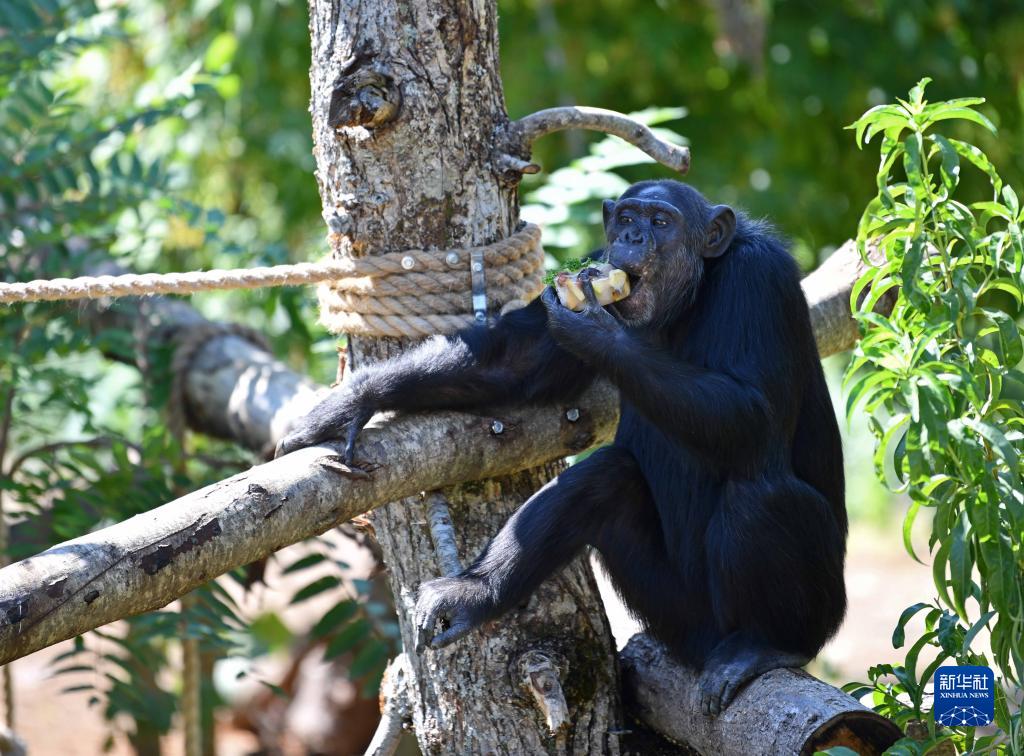 8月26日,一只黑猩猩在意大利羅馬動物園享用冰凍食物。