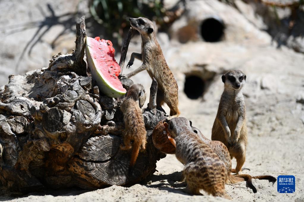 8月26日,貓鼬在意大利羅馬動物園享用冰鎮西瓜。