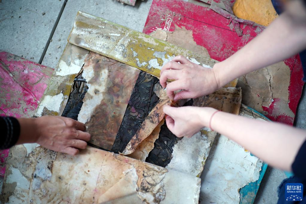 這是8月26日,志愿者在德國柏林清潔整理被浸泡的中國皮影。