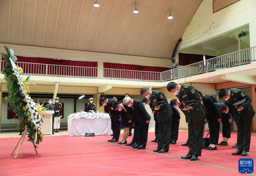 9月1日,在韓國仁川,中方代表團(tuán)成員在志愿軍烈士遺骸裝殮儀式現(xiàn)場鞠躬致敬。新華社記者 王婧嬙 攝 8月30日至9月2日,退役軍人事務(wù)部、中央宣傳部、中央對外聯(lián)絡(luò)部、中央網(wǎng)絡(luò)安全和信息化委員會辦公室、外交部、財政部、中央軍委政治工作部等部門組成的中方交接代表團(tuán)赴韓國,實(shí)施第八批在韓中國人民志愿軍烈士遺骸交接工作。中韓雙方2日將在仁川國際機(jī)場舉行遺骸交接儀式。