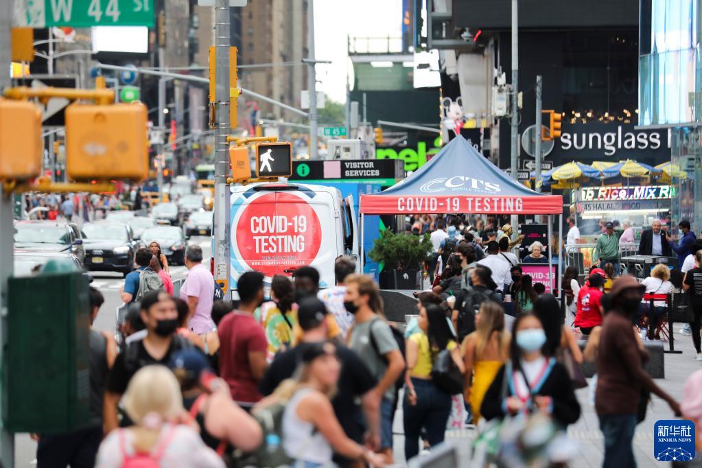 這是8月31日拍攝的美國紐約時報廣場上一處流動新冠檢測點。 約翰斯·霍普金斯大學數據顯示,美國截至8月23日至29日的7天內,累計新增新冠確診病例108.9萬例,累計死亡病例9036例。 新華社記者 王迎 攝