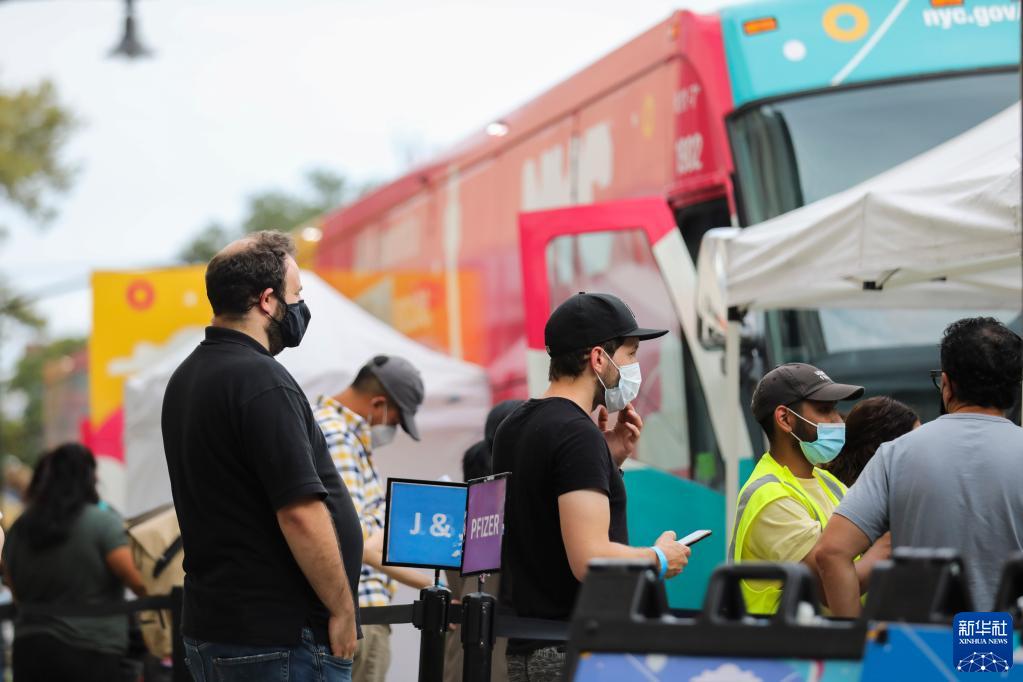 8月31日,人們在美國紐約街頭的流動疫苗接種車外排隊等候接種新冠疫苗。 約翰斯·霍普金斯大學數據顯示,美國截至8月23日至29日的7天內,累計新增新冠確診病例108.9萬例,累計死亡病例9036例。 新華社記者 王迎 攝