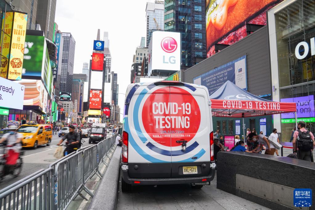 8月31日,人們在美國紐約時報廣場的流動新冠檢測點登記檢測。