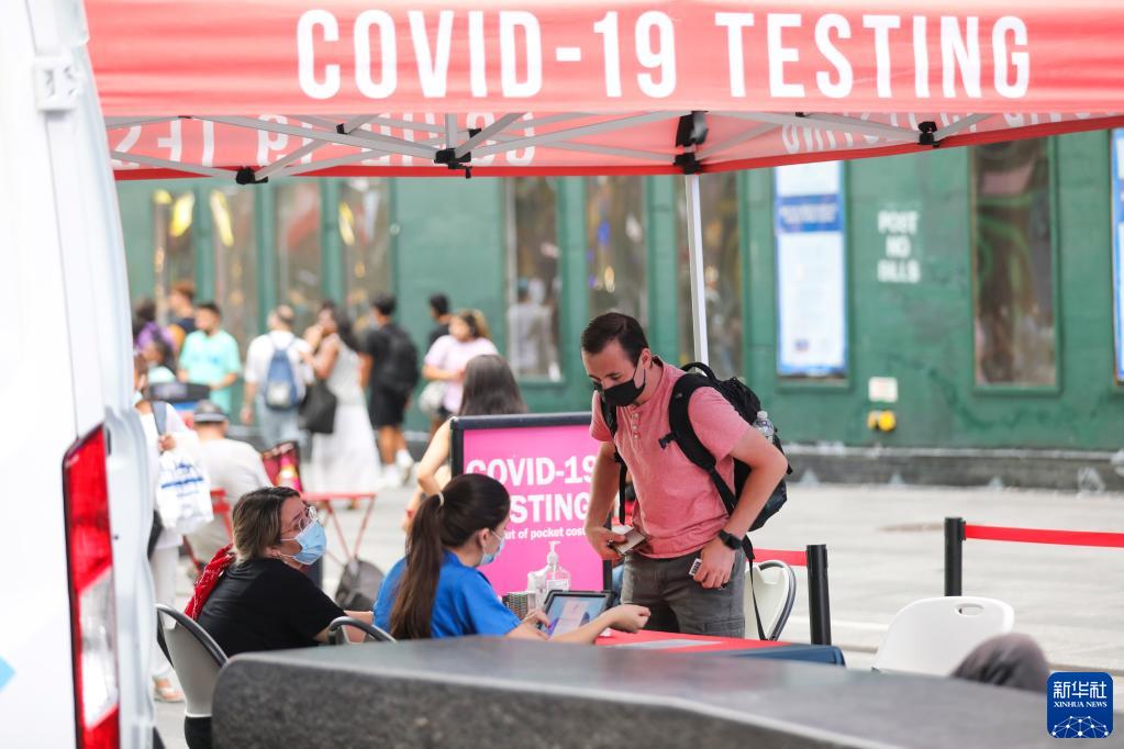 8月31日,一名男子在美國紐約時報廣場的流動新冠檢測點登記檢測。