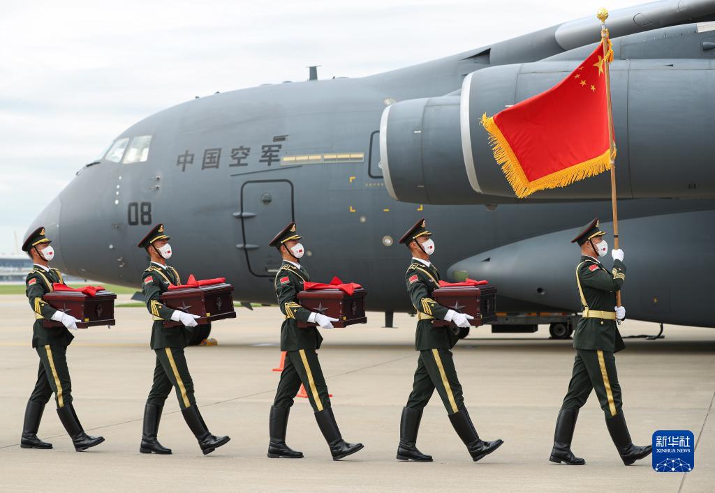 9月2日,在韓國仁川國際機場,中國人民解放軍禮兵護送烈士棺槨登上解放軍空軍專機。9月2日上午,中國和韓國在韓國仁川國際機場共同舉行在韓中國人民志愿軍烈士遺骸交接儀式。新華社記者 王婧嬙 攝