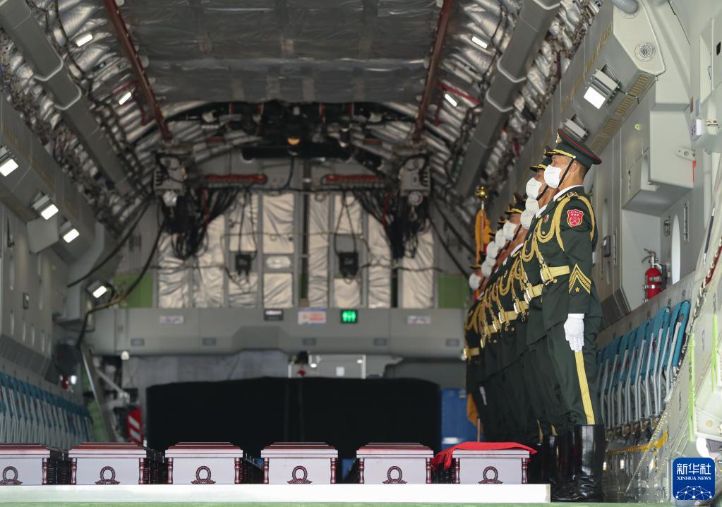 9月2日,在韓國仁川國際機場,中國人民解放軍禮兵護送烈士棺槨登上解放軍空軍專機。新華社記者 王婧嬙 攝