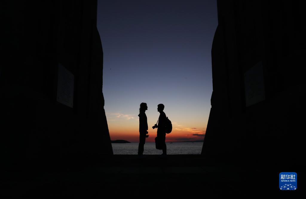 9月4日,人們在法國馬賽海邊欣賞落日時分的海景。