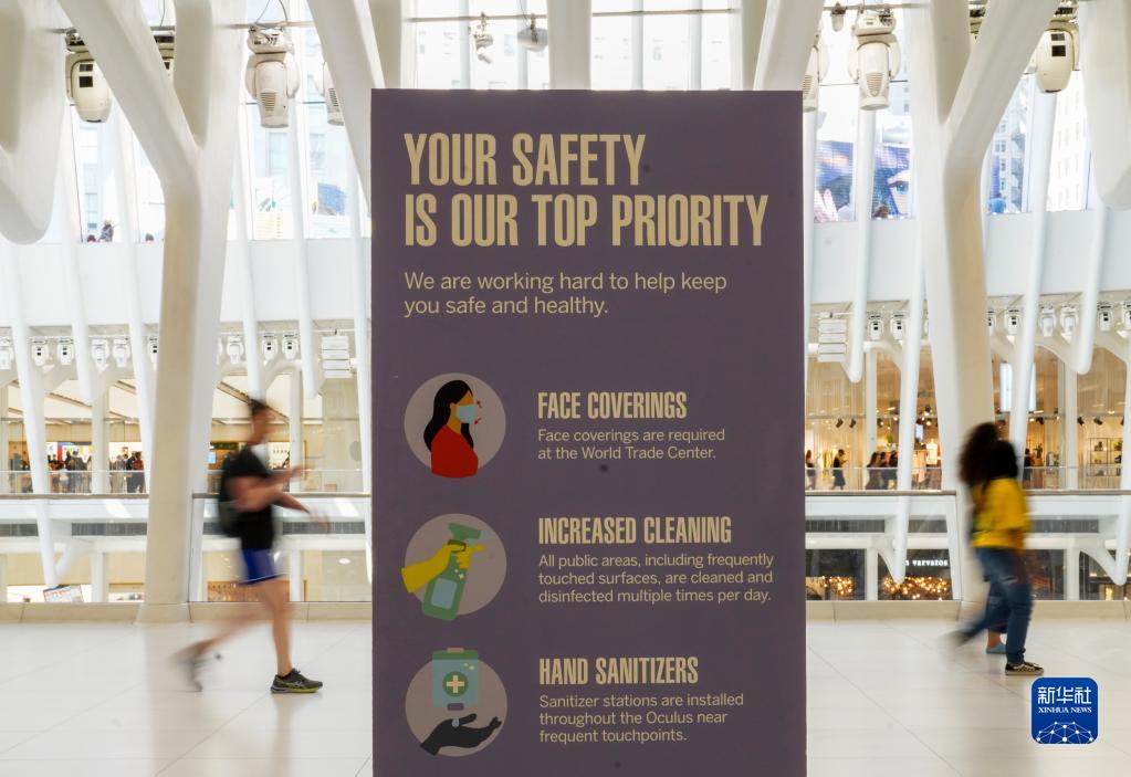 9月6日,人們走過美國紐約世貿(mào)中心車站內(nèi)的防疫提示牌。