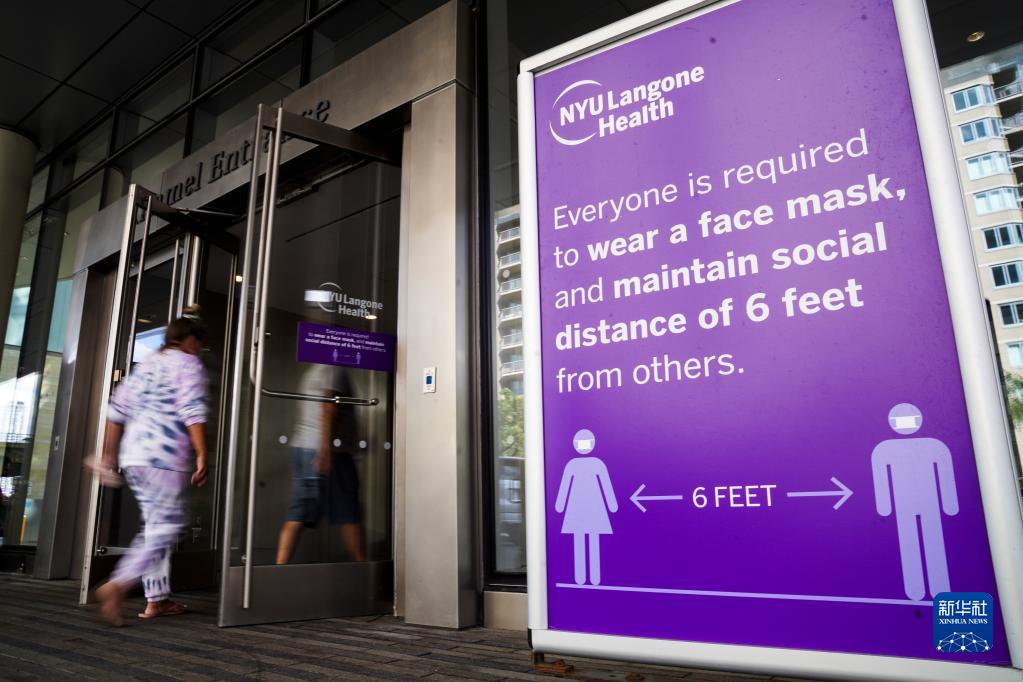 9月6日,人們走過美國紐約一家醫院的防疫提示牌。
