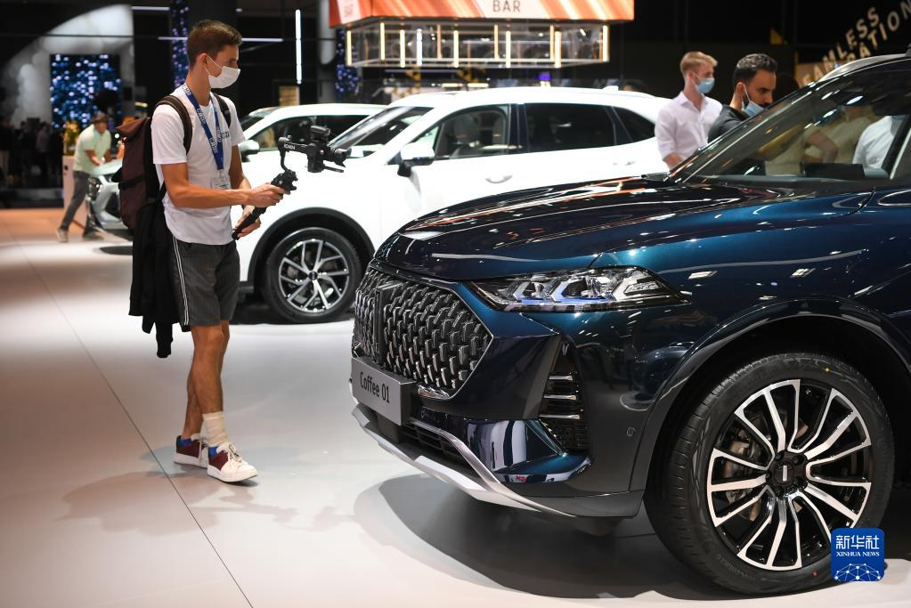 9月6日,在德國慕尼黑舉辦的德國國際汽車及智慧出行博覽會媒體日期間,人們在魏牌汽車展臺參觀。