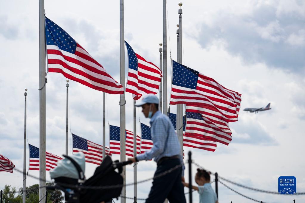 9月11日,美國華盛頓紀念碑周圍的美國國旗降半旗,紀念“9·11”恐怖襲擊事件二十周年。