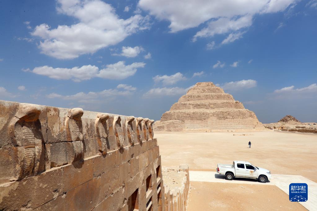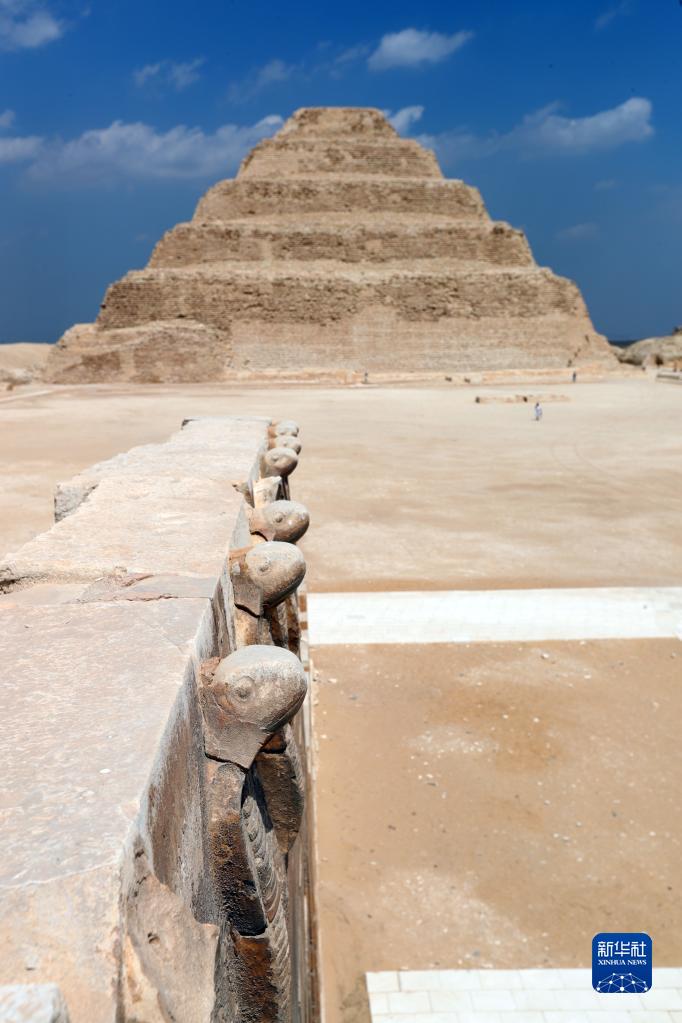 這是9月14日在埃及首都開羅以南的塞加拉地區一座左塞爾時期古墓的地上建筑拍攝的眼鏡蛇雕像,以及遠處的階梯金字塔。 當日,位于埃及首都開羅以南約30公里的塞加拉地區,一座距今4000多年的古埃及第三王朝國王左塞爾時期的古墓經過近15年的修繕后正式向公眾開放。該墓位于左塞爾王階梯金字塔建筑群西南角,由地上建筑和地下墓室兩大部分構成。埃及于2006年啟動對該墓墓道、墓墻、墓室等建筑體的保護和修繕工作。 新華社記者 隋先凱 攝
