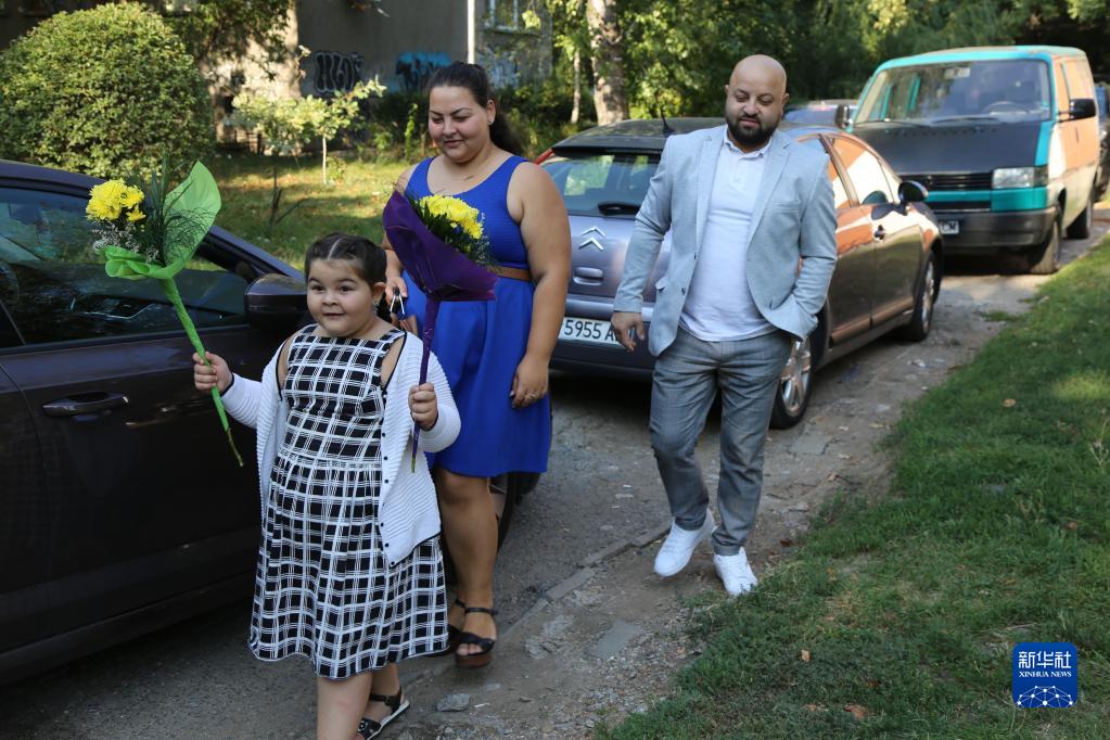 9月15日,家長在保加利亞索非亞送孩子上學。 9月15日,保加利亞迎來新學年第一天。由于新冠疫情持續蔓延,保加利亞要求四年級以上的學生在室內佩戴口罩,并定期對教室進行通風和消毒。 新華社記者 林浩 攝