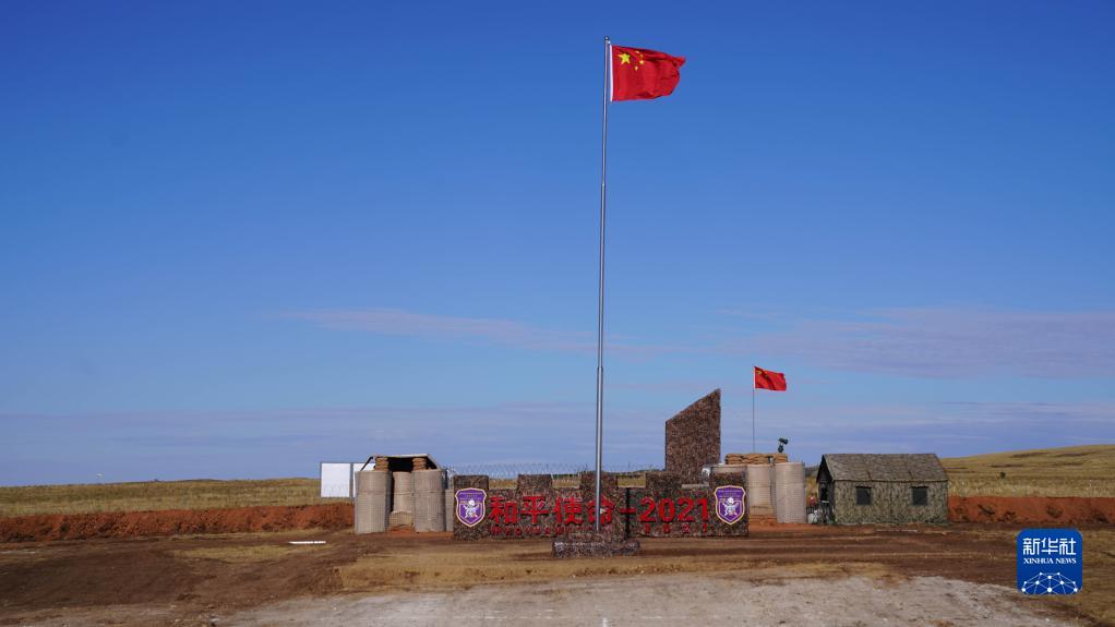 這是9月13日在俄羅斯奧倫堡州東古茲靶場拍攝的“和平使命-2021”“中國營”營區(qū)廣場。