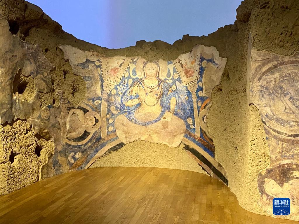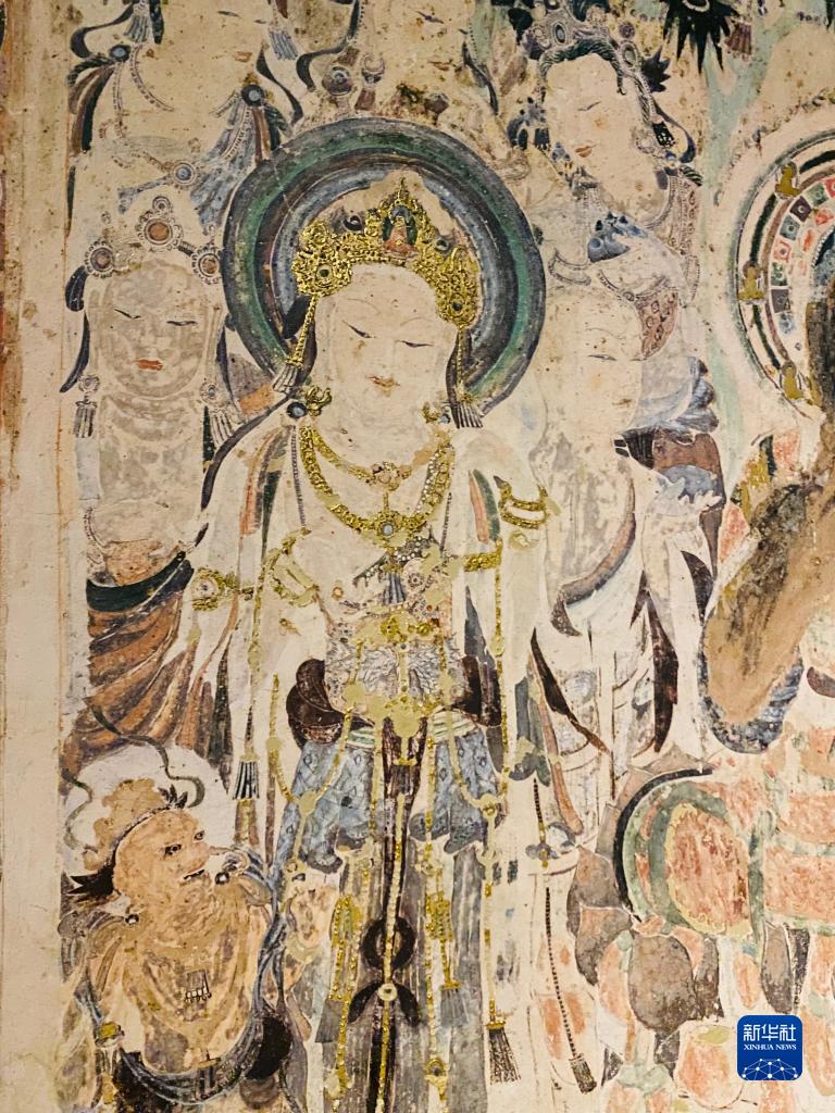 這是9月13日在日本東京藝術大學美術館拍攝的用“文化遺產克隆技術”做出的敦煌莫高窟第57窟壁畫《彌勒說法圖》局部。 從9月11日至10月10日,日本東京藝術大學美術館為參觀者提供了“時空穿梭”的機會——通過“文化遺產克隆技術”對佛像惟妙惟肖的復原,人們可以如身臨其境一般,體驗一場彌勒文化傳播之旅。 新華社記者 郭丹 攝