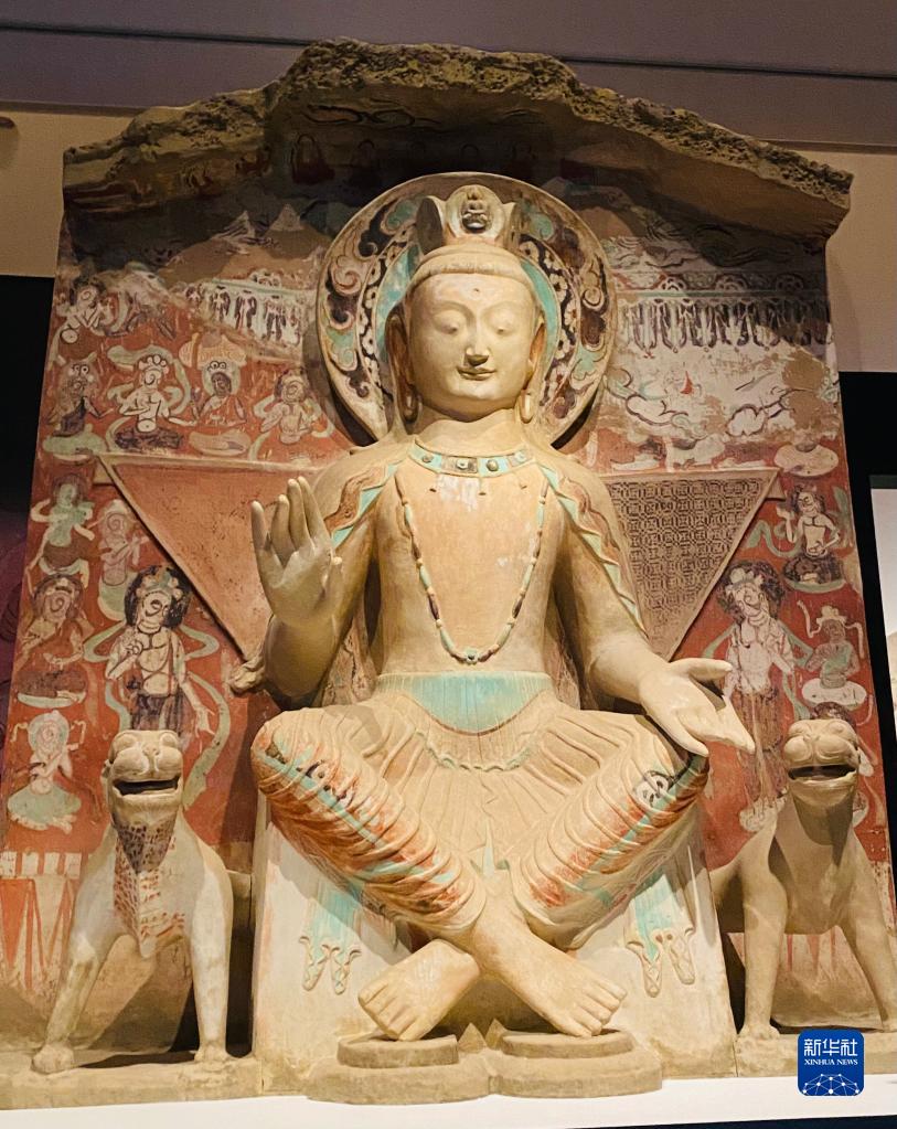 這是9月13日在日本東京藝術大學美術館拍攝的用“文化遺產克隆技術”做出的、敦煌莫高窟第275窟交腳彌勒菩薩70%比例大小的佛像。 從9月11日至10月10日,日本東京藝術大學美術館為參觀者提供了“時空穿梭”的機會——通過“文化遺產克隆技術”對佛像惟妙惟肖的復原,人們可以如身臨其境一般,體驗一場彌勒文化傳播之旅。 新華社記者 郭丹 攝