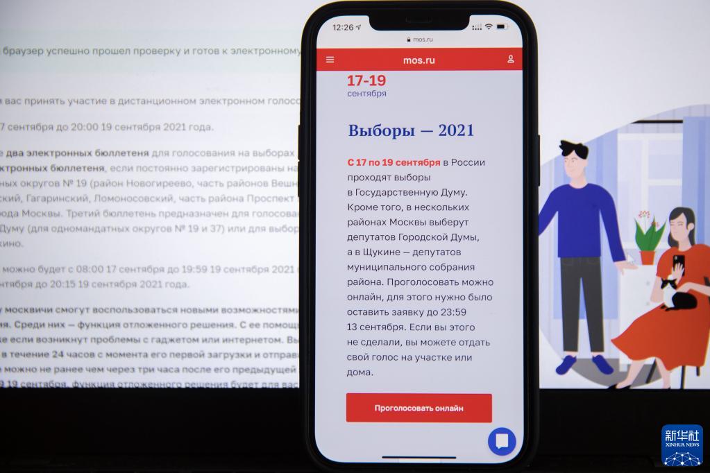 這是9月17日在俄羅斯首都莫斯科拍攝的選舉在線投票網頁。 第八屆俄羅斯國家杜馬(議會下院)選舉17日開始投票。此次選舉從17日持續至19日。受新冠疫情影響,俄部分地區選民可通過網絡方式進行投票。 新華社記者 白雪騏 攝 |