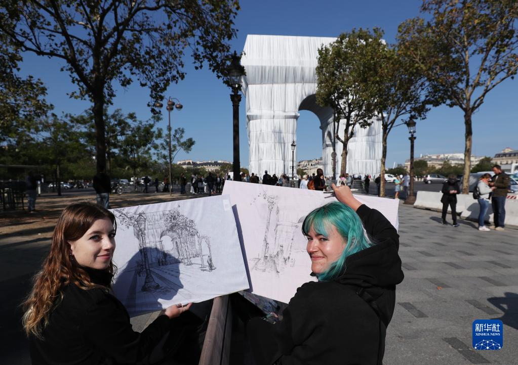 9月21日,藝術院校的學生在法國巴黎“被包裹的凱旋門”前寫生。 “被包裹的凱旋門”是保加利亞已故藝術家赫里斯托和妻子讓娜-克洛德的遺作。根據他們的構思,巴黎地標建筑凱旋門被可回收的織物包裹起來。目前,凱旋門已被2.5萬平方米藍銀色可回收織物“包裹”,并用3000米紅繩固定。“被包裹的凱旋門”藝術展于18日正式向公眾開放,10月3日結束。新華社記者高靜攝
